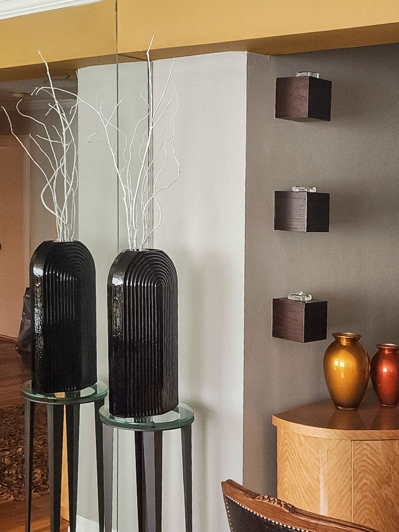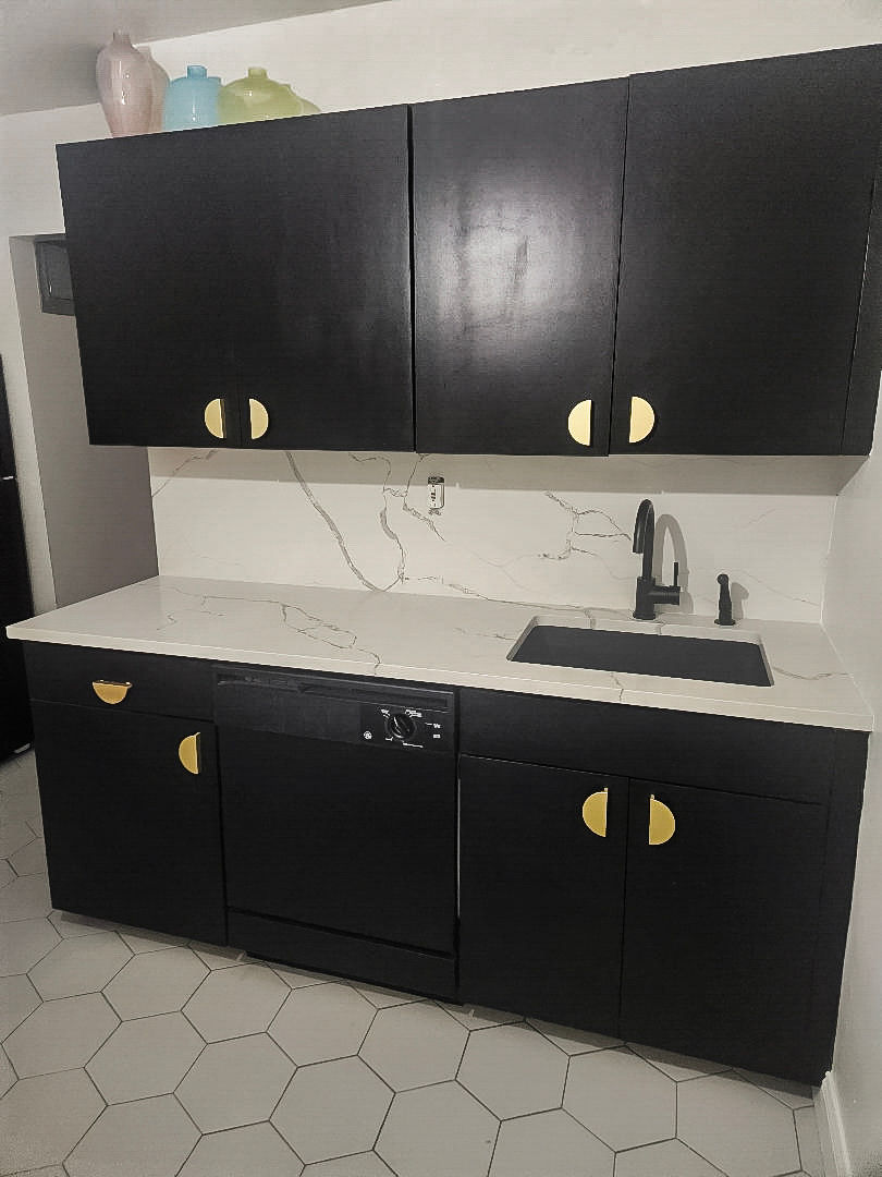 My client wanted a transitional style by mixing modern and traditional decor. We added a three piece cream leather sectional and two Louis XIV leather chairs. In the televison area we added two black velvet modern chairs. The kitchen was renovated in a modern black white and gray style.